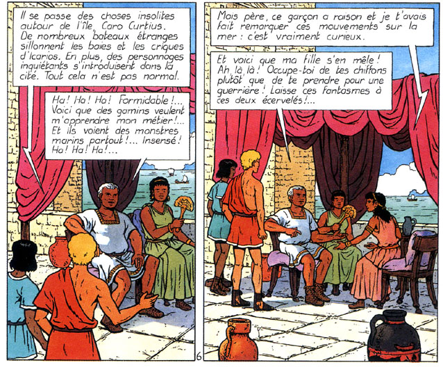 Julia se tourne alors vers Enak et lui propose de « l’aider » au gouvernail (image freudienne s’il en est). Le garçon refuse, préférant tenir tout seul les deux bouts… La fille en déchire sa tunique, entraînant une remarque acerbe du gamin : « Ah, celle-là, Elle a encore trouvé un moyen pour exhiber sa poitrine ! »
