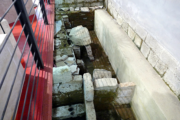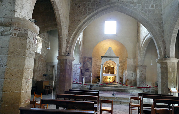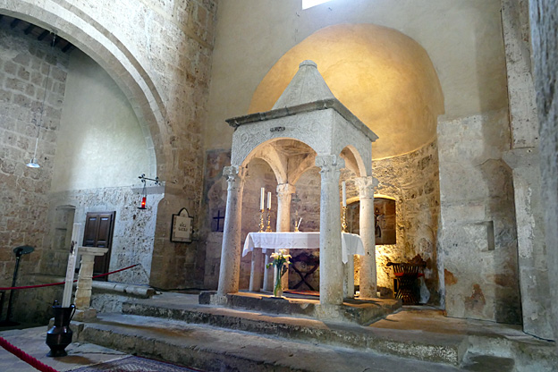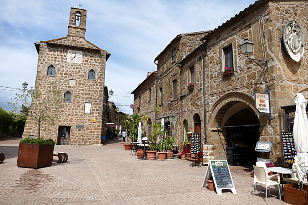 Après cette promenade, nous prenons une bière Peroni à Pitigliano, capitale d’un comté des Orsini. Le petit bourg médiéval perché aux rues étroites, aux ruelles plus étroites encore qui les traversent et donnent sur la vallée à flanc de falaise, attire quelques touristes dont une famille au jeune garçon de 7 ans entreprenant. Dans l’église, neuf blasons ornent le chœur. L’endroit est dédié à Saint-Roch, prié contre la peste, en vitrail au-dessus du portail d’entrée.