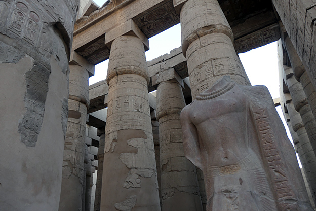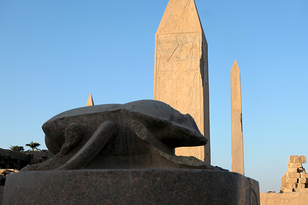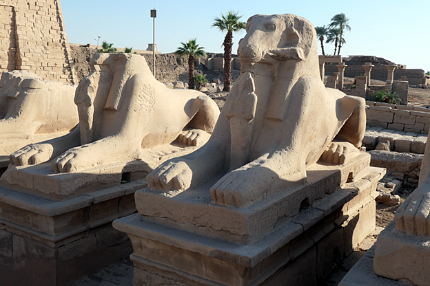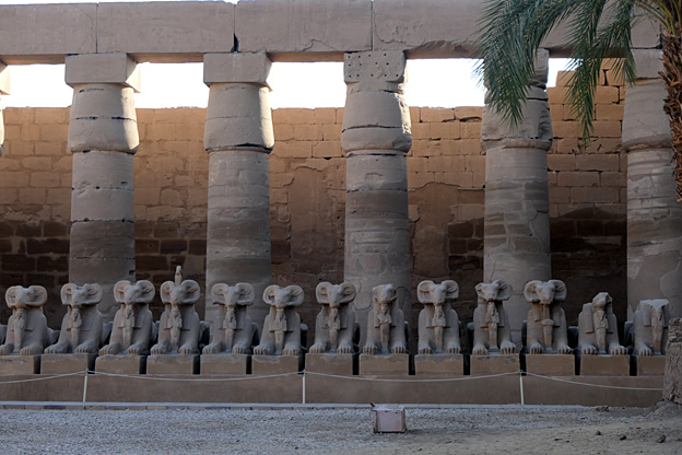 Nous déambulons avec commentaires parmi les alignements de Karnak. Je suis toujours étonné de leur gigantisme, des 34 colonnes massives de la salle hypostyle, des statues de pharaon, des obélisques. Il est dit que voici le centre religieux « le plus ancien du monde » car sa construction a duré des millénaires. Trois temples principaux, des petits temples fermés, des temples extérieurs… Le site est inscrit au patrimoine mondial de l’UNESCO depuis 1979. N’est ouverte au public que l’enceinte d’Amon, avec son allée de 40 statues d’Amon à tête de bélier sous lesquelles les touristes aiment à se faire photographier comme des moutons.