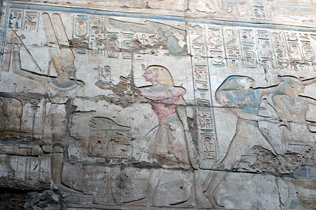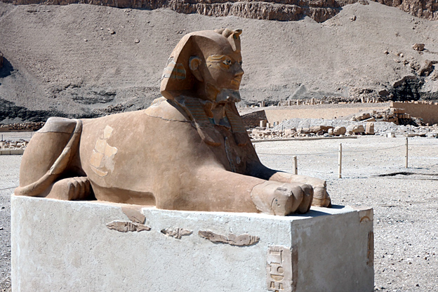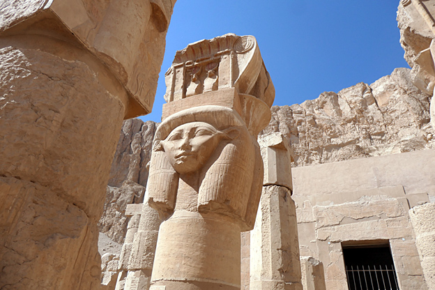 Nous marchons vers le temple d’Hatchepsout, la seule reine devenue pharaon durant la minorité de son fils Thoutmosis II (il avait cinq ans). Creusé dans la falaise, le temple est étendu et majestueux, érigé sur trois terrasses par l’architecte royal Sénènmout. Il a été martelé par Thoutmosis le fils puis par les chrétiens au IVe siècle de notre ère. Subsistent quelques colosses et têtes conservées à l’effigie de la reine, remontés par des archéologues polonais qui sont en charge des fouilles. En haut des colonnes, Hatchepsout a été représentée de face avec des oreilles de vache, ce qui est plutôt rare.