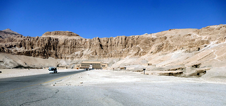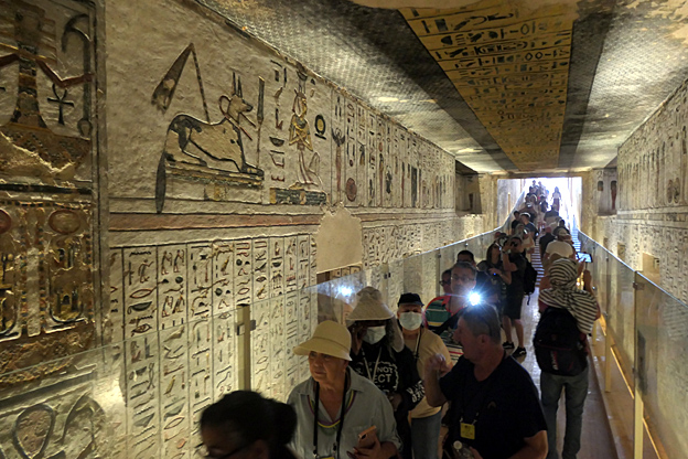 C’est une véritable autoroute qui s’enfonce dans la montagne de Thèbes pour joindre la Vallée des rois. Nous longeons la vallée des nobles et des prêtres à flanc de colline. Le tourisme a désormais remplacé le pharaon dans la royauté et tout est fait pour contenter l’Occidental. Des minibus électriques de fabrication égyptienne, à la grande fierté de Mo (bien que les batteries soient probablement chinoises), conduisent du parking des bus à l’entrée du site. Occasion, bien évidemment, de faire payer un petit supplément à ceux qui ne veulent pas marcher sous le cagnard. Il y a la queue et tous les sacs sont passés aux rayons X, comme d’habitude. Il fait une chaleur à crever et il n’est pas encore 10 heures du matin.