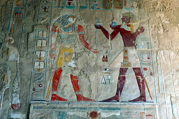 Sous la colonnade, sont sculptées des scènes de commerce avec la côte des Somalis. Elles montrent des arbres à encens, des barques chargées de marchandises africaines, une balance avec d’un côté des boules (peut-être d’or) et de l’autre des vaches. La vache est l’animal symbole de la déesse Hathor, enveloppe protectrice du soleil ; elle a de beaux yeux et lèche la main de la reine.