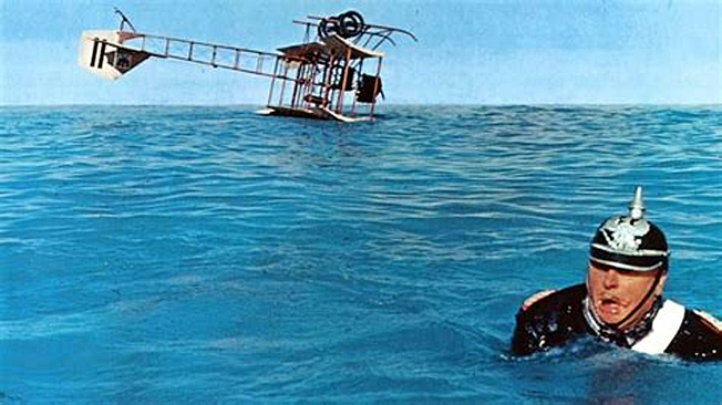 L’Allemand colonel Manfred von Holstein (Gert Fröbe) est mandaté par le Kaiser pour gagner la course. Il organise l’opération avec une rigueur toute militaire, marche au pas, musique martiale, lever des couleurs, obéissance aveugle au Manuel d’instruction de l’avion. Ni lui, ni le capitaine qu’il veut pour pilote n’a jamais touché un tel engin mais « un officier allemand est capable de tout faire ». Obstination et discipline ne lui réussiront pas : il perdra la course en plongeant en pleine Manche parce qu’il se fie trop aux instruction du Manuel et qu’il est incapable de gérer l’avion s’il n’a plus le texte sous les yeux.