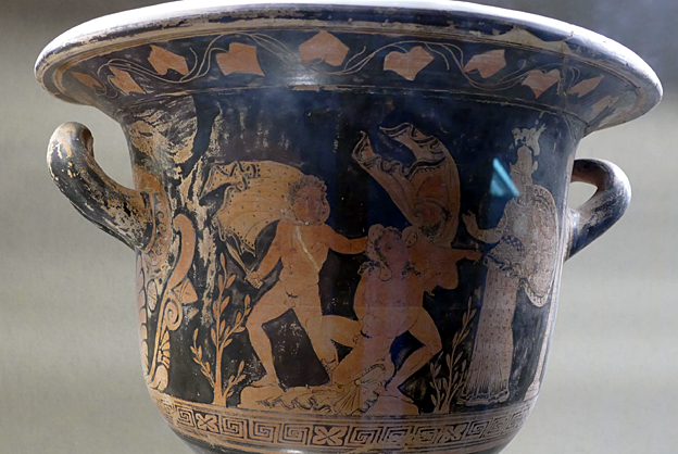 La Gorgone (ou Méduse), à l’inverse, tire l’homme vers le bas, vers les enfers (Hadès) et la mort. Elle pétrifie, son extrême altérité terrifie, elle glace en mettant face à soi le miroir de soi figé, immobile dans le néant. Puissance de mort, elle est représentée sur les boucliers des Achéens qui attaquent Troie. Les guerriers renvoient en miroir ce qu’ils promettent à leurs ennemis, tout en poussant des cris gutturaux pareils aux sons proférés par les serpents, les chiens et les chevaux en fureur, qu’on dit être ceux poussés aussi par les morts dans l’Hadès. Les éphèbes sont incités à laisser pousser une longue chevelure qui les rendra plus terrifiants au combat, comme les serpents autour de la tête de Méduse. Cette crinière ajoute à leur aspect sauvage et contribue à les posséder d’une fureur de carnage.