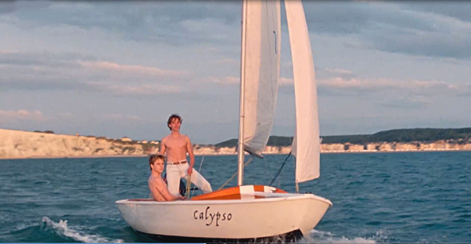 Alexis part en dériveur bronzer en mer. Endormi, il est réveillé par un orage qui gronde. Vite, en slip et chemise ouverte, il tente de hisser la grand-voile qu’il a laissée affalée n’importe comment ; la drisse coince, il s’énerve, le dériveur peu stable chavire et le précipite à la baille. Rien de grave mais impossible de remonter sur la coque retournée, trop lisse. A 16 ans, on attend encore les secours des autres plutôt que de se prendre en mains ; Alexis est passif, victime et vulnérable. C’est alors que surgit David son sauveur, le héros vigoureux qui lui conseille rationnellement d’agripper la dérive pour retourner le bateau à l’endroit, avant qu’il le remorque au moteur jusqu’à la plage où il pourra se sécher. David encore qui l’entoure, l’entraîne chez lui où sa mère le materne par un déshabillage de gamin, un bain chaud moussant dans le « sarcophage » de la baignoire, puis un thé brûlant ; David qui lui prête ses propres vêtements pour rentrer chez lui et qui va s’occuper de tout, même de ramener le bateau à son anneau de port. Il n’en fera rien, Alexis l’apprendra plus tard du copain de lycée qui lui a prêté le dériveur, première fissure dans l’image lisse et sculptée de son héros.