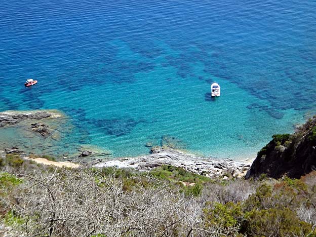 Nous poursuivons par le sentier côtier, surplombant ou longeant les plages, ne faisant presque aucune grâce des moindres découpes de la côte. Mais l’eau est si bleue et la senteur des pins si balsamique que s’en est un plaisir. Sauf que nous devons subir une ou deux grimpées très rudes vers la route ou dans des raccourcis. Nous passons devant le Forte Focardo, un fort construit par les Espagnols en 1678 pour commander la baie de Porto Azzurro.