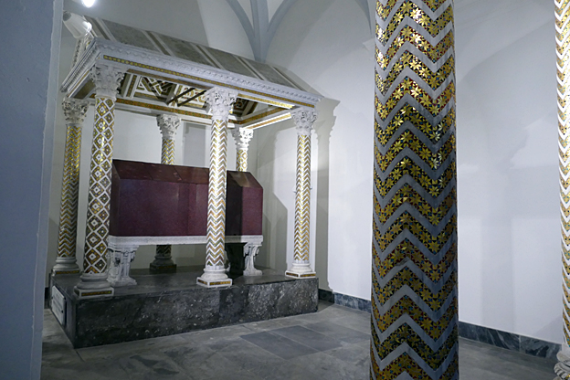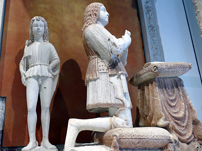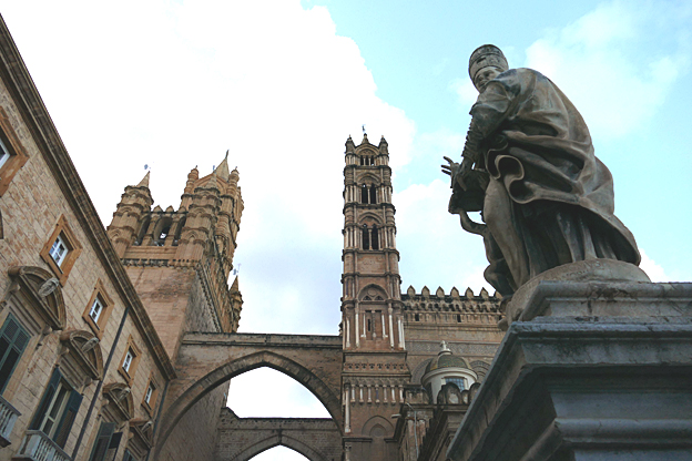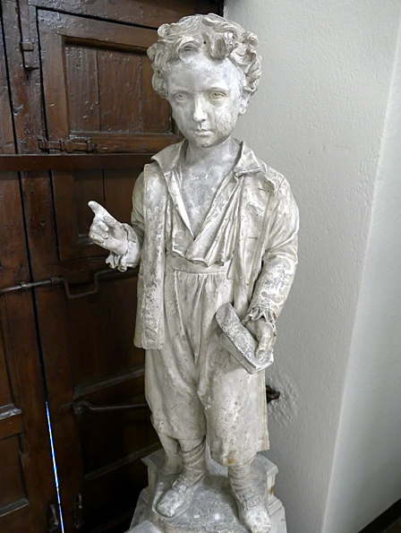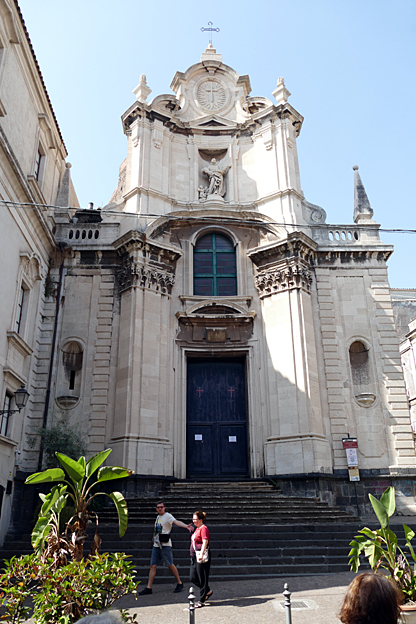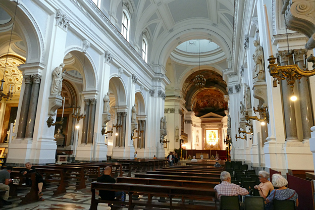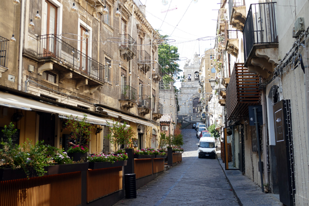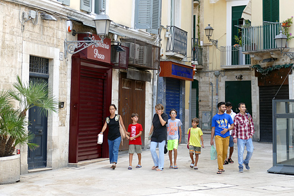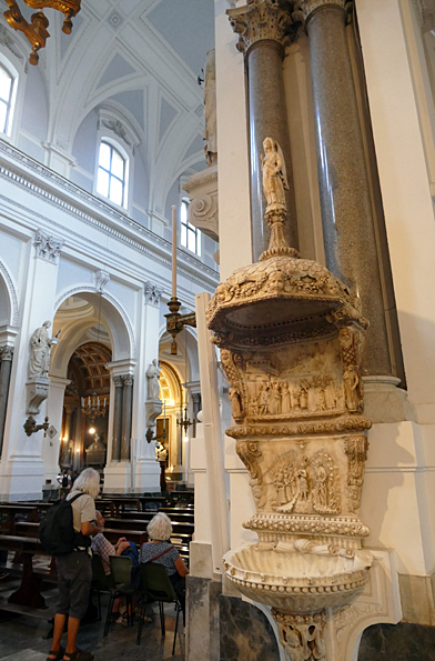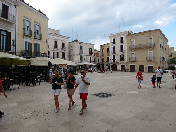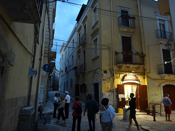 Le déjeuner étant libre, je fais table avec quatre autres personnes, les deux couples de l’infirmière et des profs au restaurant Al Pescatore sur la piazzetta di Marina Corta où trône la statue de san Bartolomeo. Je prends un poulpe grillé servi avec deux lambeaux de fromage, une tomate cerise sur une cuillerée d’encre de seiche et une cuillère à café de purée de pois verts. C’est le style nouvelle cuisine pour 20 € avec une salade de roquette, fenouil et quartiers d’orange assaisonnée d’huile d’olive et de vinaigre balsamique. Je retiens la recette.