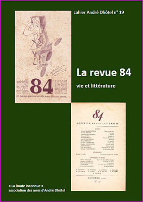 Ce numéro rappelle qu’André Dhôtel, le célèbre auteur du roman initiatique Le pays où l’on n’arrive jamais, fut aussi un homme de lettres prolifique participant à la vie littéraire de son temps. Il a notamment activement participé à l’aventure de la revue 84. Ce fut une revue des Editions de Minuit qui s’étira sur 18 numéros (aux parutions irrégulières) en 14 livraisons de mars 1947 à mai-juin 1951. « Même si elle n’a pas laissé une trace durable dans l’histoire littéraire, [la revue] fut, de l’avis de tous, une exceptionnelle occasion d’amitié et de réussite littéraire », écrit Philippe Blondeau, poète collaborateur de revues.