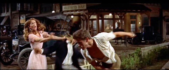 Cal, qui suit d’abord Kate sa présumée mère (Jo Van Fleet, 40 ans mais ravagée) avant de forcer sa porte pour se faire reconnaître d’elle, la convainc de lui prêter 5000 $ pour lancer son affaire. Touchée de son obstination et reconnaissant en lui un rejeton qui lui ressemble (beau gosse, rebelle, doué en affaires), elle consent. Aidé d’un adulte associé, Cal achète 5 cts le kilo de haricots secs pour le revendre 18 cts au bureau du ravitaillement de guerre anglais, dégageant un beau bénéfice. Mais l’argent, pour Adam, est fils du péché ; c’est voler le paysan qui a produit. Il ne veut pas de ce don du fils et Cal désespère de tout amour. Lui qui voulait bien faire est rejeté. La scène entre le père et le fils, sous les yeux du frère et de la fiancée, est un moment très fort du film. Le spectateur foutrait volontiers son poing sur la gueule du Vertueux et jetterait sa « Bible » au feu illico s’il était dans l’histoire. A quoi sert un « guide de se bien conduire » si l’on se conduit de façon aussi égoïste et obtuse avec tant de bonne conscience dévoyée ?