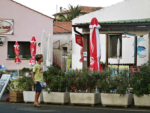 Le sentier côtier suit le bord de la plage, parfois sous la pinède, parfois dans les ajoncs. Nous marchons même une bonne heure sur le sable, tout au bord de l’eau, ce qui fatigue les mollets. Derrière les lunettes noires, nous pouvons observer les corps étalés des adultes, pas toujours plaisants, les jeux intéressants des petits, les peaux bronzées et le mouvement des muscles sur les poitrines. Un ado chahute avec son père. Il lui lance une balle en dansant devant lui, debout, tous muscles dehors, alors que son géniteur reste allongé sur sa serviette, sans bouger, comme recevant l’hommage de la jeunesse. Un bon tableau psychologique. Les femmes nous observent passer, comparent. Nous formons un groupe bizarre sur la plage, cheminant en sac à dos et grosses chaussures au lieu d’être pieds nus en slip ou en T-shirt comme tout le monde.
