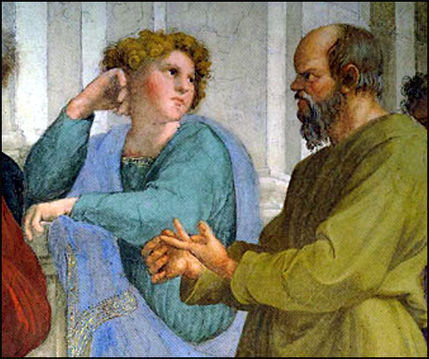 Sa relation avec Socrate est restée « platonique », dit-on. Le philosophe, laid et volontiers adepte du renoncement et de la sublimation, vénérait la beauté morale plus que la physique, ce qui ne l’empêchait pas d’admirer l’éphèbe. Alcibiade, vers quinze ans, a voulu le séduire en couchant nu contre lui, l’enlaçant sous leurs manteaux, dans le même lit. Mais « je me levai après avoir dormi aux côtés de Socrate, sans que rien de plus extraordinaire ce fut passé que si j’avais dormi près de mon père ou de mon frère aîné », dit-il au Banquet (219 b-e). « Il est le seul homme devant qui j’ai honte » (216 a-c), son père de substitution, en quelque sorte. Plutarque note qu’il était encore adolescent à l’expédition de Potidée. Il appartenait à la tente de Socrate. Durant la bataille, blessé, Alcibiade était tombé à terre et Socrate se plaça devant lui pour le protéger. C’est ce que rappelle Alcibiade dans ‘Le Banquet’ en rendant hommage à son vieux maître. A 19 ans, il y gagne le prix de la valeur au combat. Huit ans plus tard, il rendra la pareille à la défaite du Délion, protégeant physiquement la retraite de Socrate. Le vieux philosophe l’a sans doute rendu meilleur en rabaissant son orgueil et lui donnant exemple des vertus qu’il pouvait receler.
