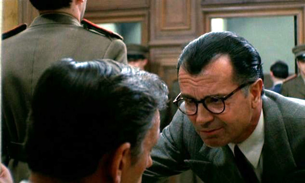 Le film montre l’effarement du bon communiste méritant de se voir accusé de complot et de crimes qu’il n’a pas conscience d’avoir commis ; puis sa fatigue devant les pinaillages des accusateurs, surtout un ancien commissaire de police sous l’ancien régime puis sous le nazisme (Gabriele Ferzetti) qui lui fait « avouer » par syllogisme de vrais-faux faits tels que « vous avez pris contact avec Untel en 1947, lequel Untel a été reconnu coupable d’espionnage au profit de l’Ouest en 1949, donc vous avez eu un contact avec un espion de l’Ouest ». C’est imparable car à la fois véritablement faux (comment savoir en 1947 qu’Untel était un espion puisqu’il n’a été démasqué qu’en 1949 ?) et formellement vrai (puisque ledit Untel était réellement un espion).